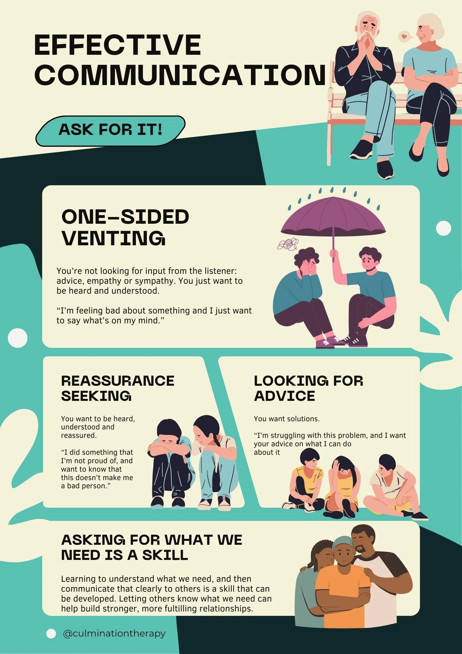 Asking for what you need is a skill that can be learned! Use this infographic to help you determine what you might need in conversation with someone, and ways of asking for it.